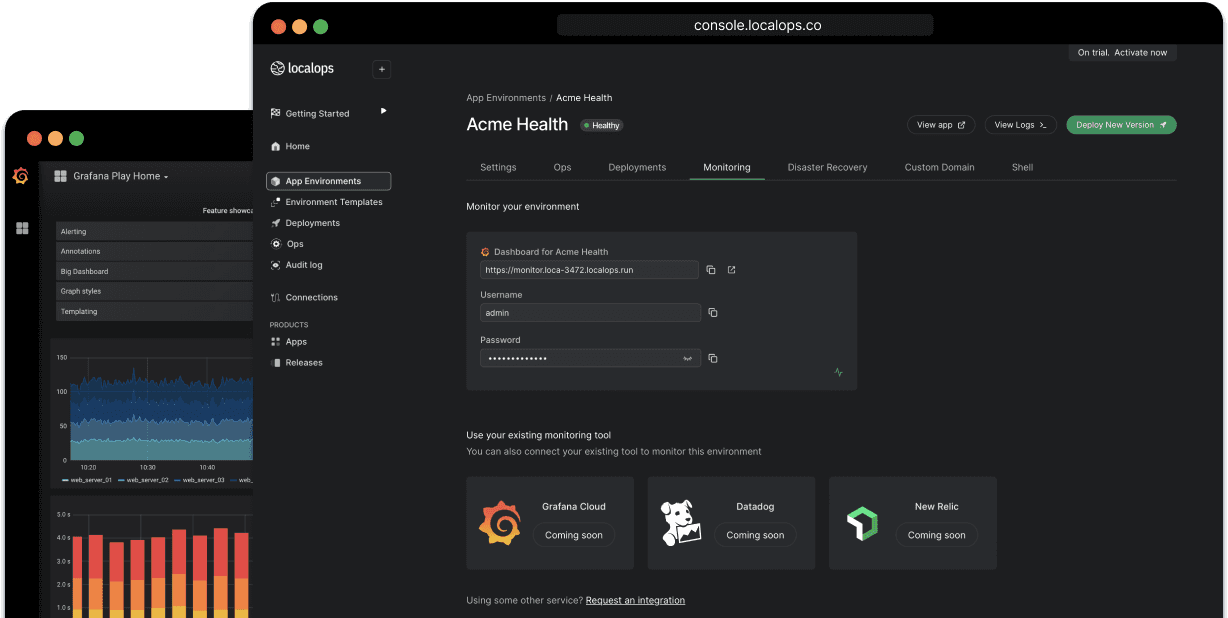 Keep track of your app's performance using pre-configured cloud native monitoring tools such Prometheus, Loki and Grafana.